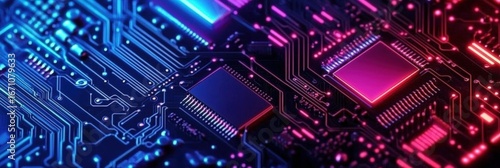 A vibrant close-up of a circuit board showcasing intricate patterns, with blue and pink lighting creating a futuristic look.