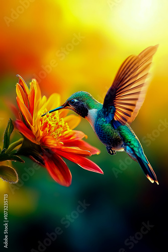 A vibrant close-up of a hummingbird in mid-flight, gracefully hovering as it pollinates a bright flower.