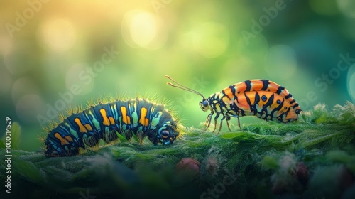 A vibrant close-up of two colorful caterpillars resting on a mossy surface, surrounded by a soft, blurred green background, showcasing nature's intricate details.