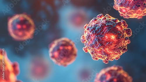 A vibrant close-up of virus-like particles, showcasing intricate details and glowing elements against a blurred background.