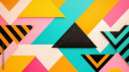 A vibrant collage of geometric shapes in bold colors, featuring triangles and stripes against a bright background.