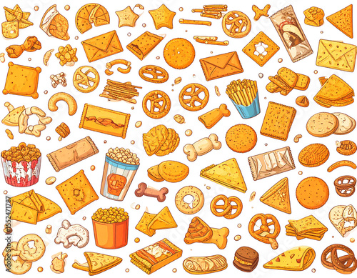 A vibrant collage of various salty snacks and crackers, showcasing a delightful array of textures and shapes