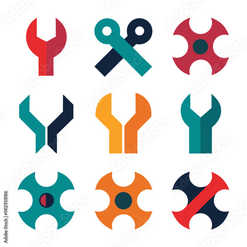 A vibrant collection of bold, geometric wrench and shuriken icons showcasing a playful yet professional design style with flat colors and simple shapes.