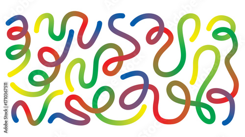 A vibrant collection of colorful gradient organic line elements featuring flowing curved shapes in rainbow hues including pink, blue, yellow, green, purple, orange, and cyan. Designed in a modern