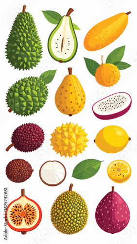 A vibrant collection of diverse tropical fruits, some whole, some sliced, showcasing their textures and colors.