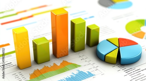 A vibrant collection of graphs and charts showcasing data analysis with colorful bar graphs and pie charts on a report background.