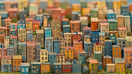A vibrant collection of miniature houses in various colors, showcasing a whimsical townscape with a playful and artistic vibe.
