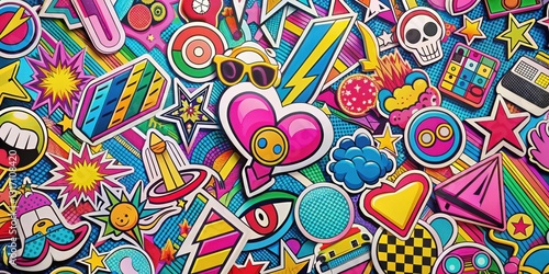 A vibrant collection of playful stickers featuring various shapes, patterns, and bold colors, creating a dynamic and energetic visual experience.