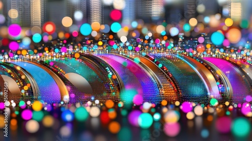 A vibrant, colorful abstract image featuring a series of arcs adorned with glowing orbs, creating a lively and energetic atmosphere.