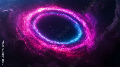 A vibrant cosmic nebula showcasing dynamic swirls of pink and blue energy, set against a dark expansive background, creating a mesmerizing celestial scene.