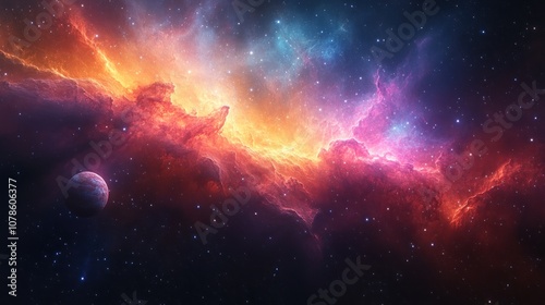 A vibrant cosmic scene depicting nebulae and a distant planet.
