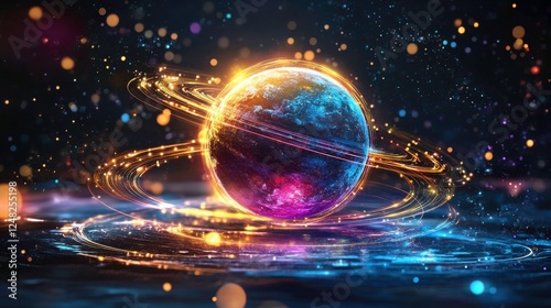 A vibrant cosmic scene featuring a glowing planet surrounded by luminous rings and swirling particles in a dark, starry background.