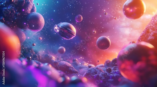 A vibrant cosmic scene featuring colorful planets and nebulae glowing amidst a starry backdrop.