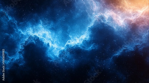 A vibrant cosmic scene featuring swirling clouds of blue and orange, representing space.