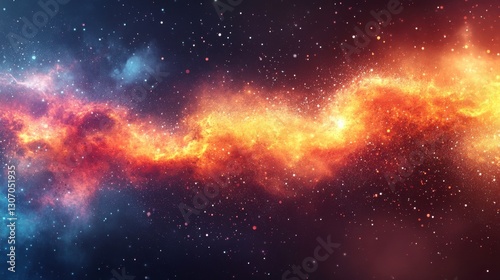 A vibrant cosmic scene featuring swirling nebulae in shades of orange and blue, set against a backdrop of countless stars.