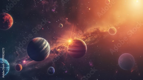 A vibrant cosmic scene featuring various planets and a glowing galaxy in the background.