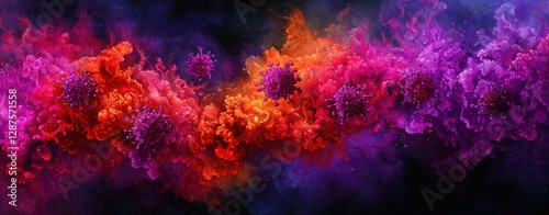 A vibrant, cosmic scene filled with swirling clouds of pink, purple, and orange, resembling a nebula set against a dark backdrop.