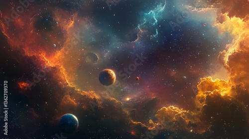 A vibrant cosmic scene with floating planets, colorful nebulas, and sparkling stars.