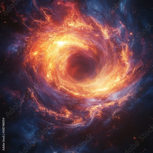 A vibrant cosmic swirl of deep blues and fiery oranges, depicting a celestial vortex in the vastness of space.