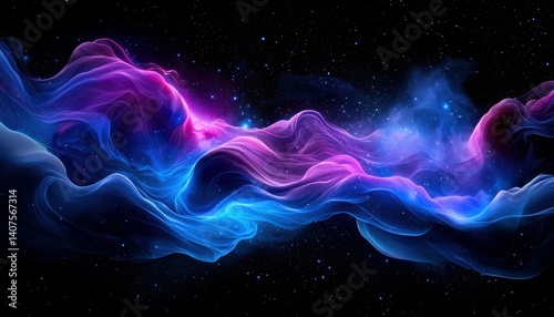 A vibrant cosmic wave of colors in blue and pink against a starry background.