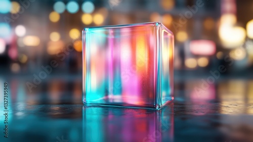 A vibrant cube sits centrally, surrounded by a dynamic, blurred background filled with colorful lights that suggest energy and excitement found in urban environments.
