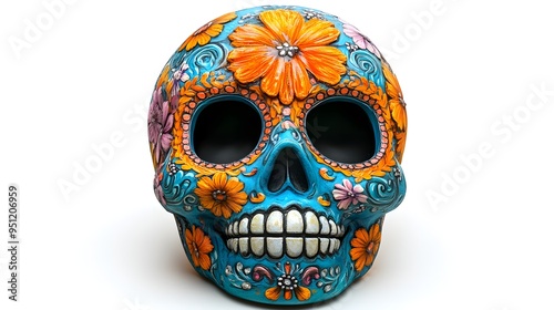 A vibrant Day of the Dead sugar skull mask, intricately decorated with floral patterns, set for a Halloween party, 3D render, vivid colors, isolated on white background