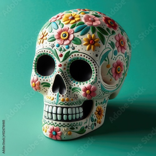 A vibrant decorative skull showcasing traditional Mexican artistry for Día de los Muertos, embodying the celebration of life and remembrance.
