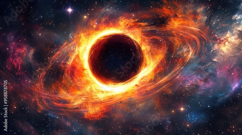 A vibrant depiction of a black hole surrounded by cosmic elements and swirling colors.