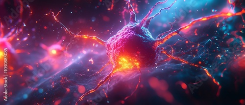 A vibrant depiction of a neuron surrounded by glowing particles, showcasing the beauty of cellular activity in a colorful abstract style.