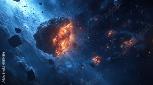 A vibrant depiction of an asteroid field with glowing fragments in space.