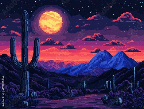 A vibrant desert scene at night, featuring towering cacti, a glowing moon, and dramatic mountains under a starry sky.