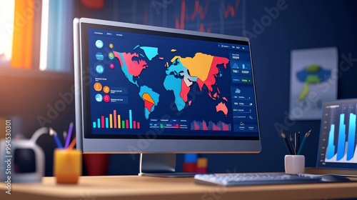 A vibrant desktop setup showcasing a monitor displaying colorful world maps and data visualizations ideal for tech and business.