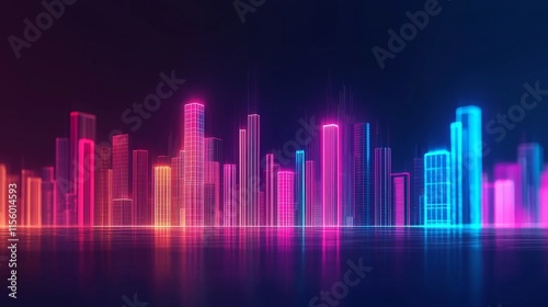 A vibrant digital city skyline illuminated with neon colors, showcasing a futuristic aesthetic against a dark background.