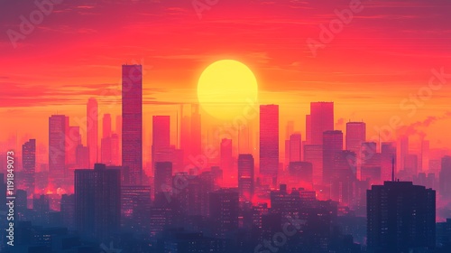 A vibrant digital illustration of a city skyline at sunset. The sun is a large, bright orb in the sky, casting a warm glow over the buildings.