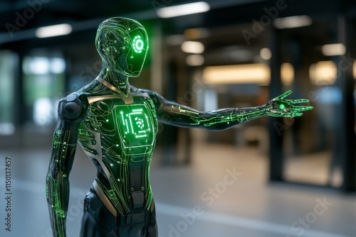 A vibrant digital illustration of a future scientist interacting with a glowing AI entity in a lab filled with advanced technology