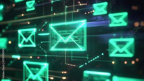 A vibrant digital illustration showcasing glowing green email icons against a high-tech background