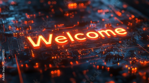 A vibrant, digital landscape featuring glowing circuits and the word 'Welcome' illuminated in orange