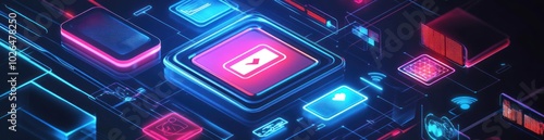 A vibrant digital landscape featuring glowing icons and circuitry, representing technology.