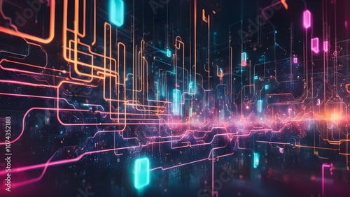 A vibrant digital landscape featuring glowing lines and nodes, representing technology and data flow.