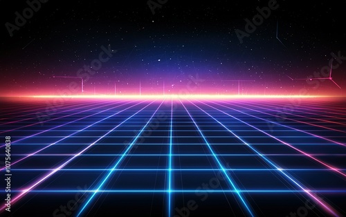 A vibrant digital landscape with neon grid lines and cosmic background in a retro-futuristic style at night
