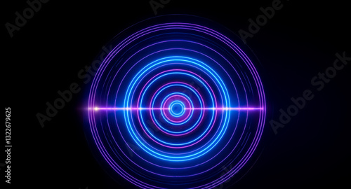 A vibrant digital rendering showcases concentric circles radiating outwards in shades of blue and purple. A horizontal light streak cuts through the center against a stark black backdrop.
