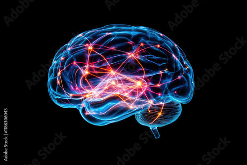 A vibrant digital representation of a brain with neural connections illuminated in blue and pink against a black background.