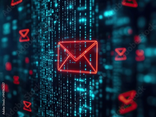 A vibrant digital representation of email communication, featuring glowing red envelopes amidst a backdrop of binary code.