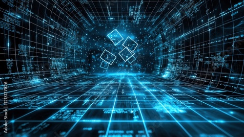 A vibrant digital tunnel filled with glowing grid patterns and floating geometric shapes creates a futuristic atmosphere, illustrating advanced technology and creativity