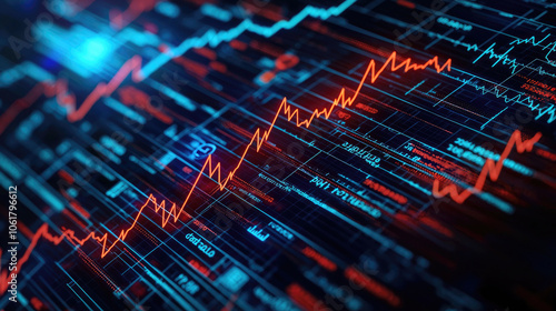 A vibrant, digital visualization of fluctuating stock market graphs, featuring lines in blue and red against a grid background.