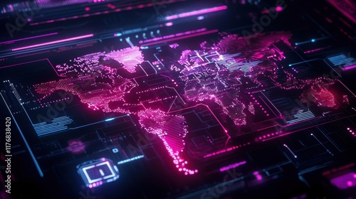 A vibrant, digital world map with neon pink highlights, showcasing a tech-inspired design, ideal for themes related to technology and global connectivity.