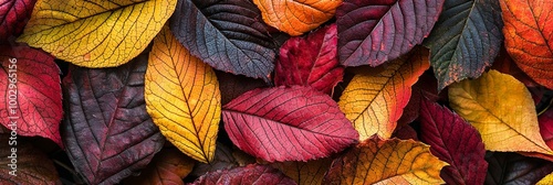 A vibrant display of autumn leaves in various colors, including reds and...