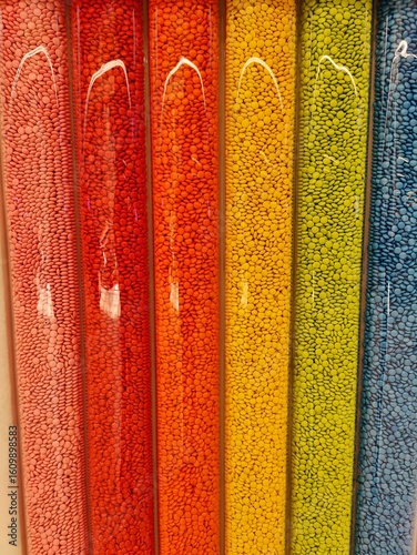 A vibrant display of colorful candy tubes, showcasing a gradient of pink, red, orange, yellow, lime green, and blue chocolate candies.