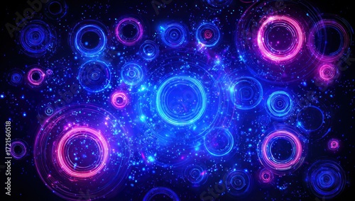 A vibrant display of concentric circles in radiant fuchsia and electric blue hues, set against a dark background, evokes a sense of otherworldly energy.