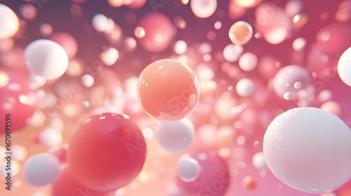 A vibrant display of floating, glossy spheres in soft pink and white tones, set against a gradient background.